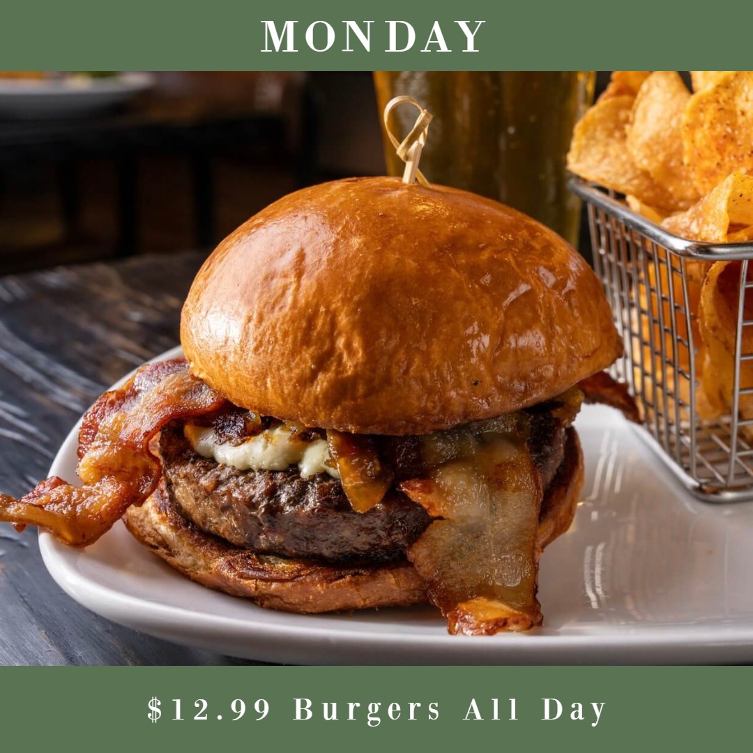 Enjoy your choice of any burger on our menu for only $12.99 (additional mods extra)